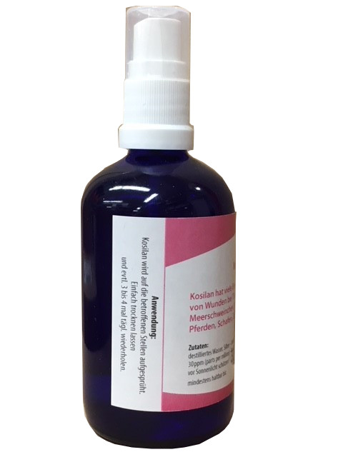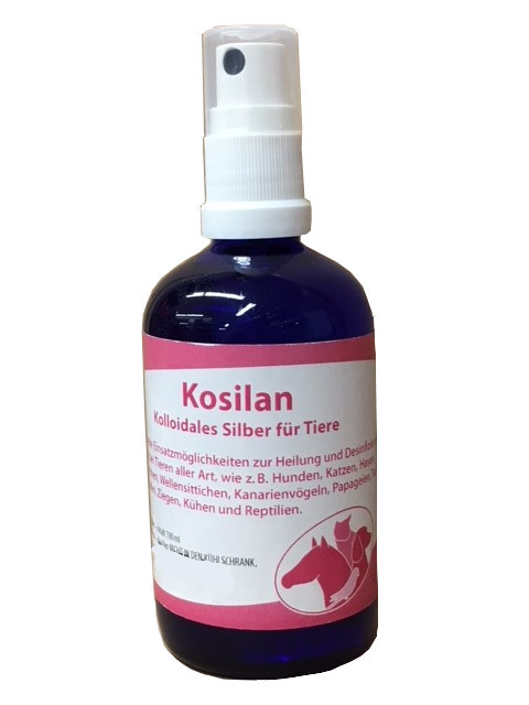 Das Produkt Kosilan mit 30 ppm Silbergehalt desinfiziert und fördert eine schnellere Heilung bei Entzündungen, Bisswunden und Kratzwunden bei Tieren, wie z.B. Pferden, Hunden, Katzen, Ziervögeln und Kleintieren sowie Nutztieren.
