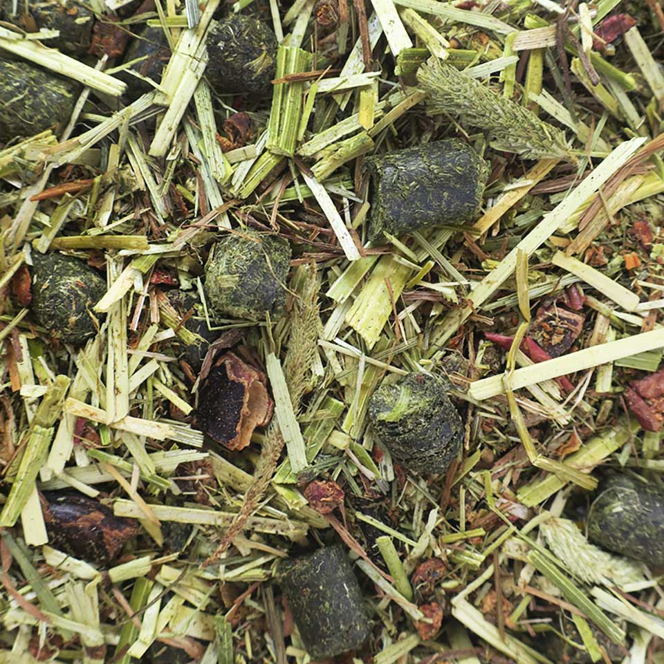 Grünmehl, Apfeltrester, Heu aus Timotheegräsern (gehäckselt, entstaubt), Luzernehäcksel (gereinigt), Johannisbrotfrucht, Rapsöl, Birkenrinde, Obstessig