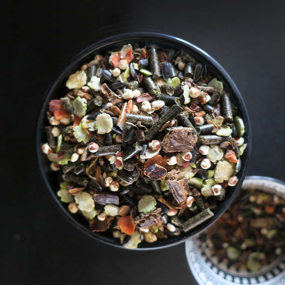 Grünmehl, Apfeltrester, Erbsenflocken, Sonnenblumenkerne, Johannisbrotfrucht, Rapsöl, Sonnenblumenextraktionsschrot, Karotten getrocknet, Hirse gepoppt, Leinsaat (thermisch aufgeschlossen), Natriumchlorid, Calciumcarbonat, Obstessig, Lignocellulose, Rapsextraktionsschrotfutter mit Stock aufgeschlossen