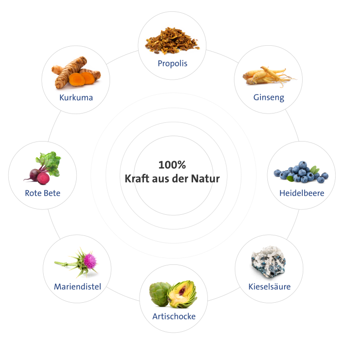 Wasser, Dattelpaste, Rote-Beetesaft, Artischockensaft, Stabilisator: Gummi Arabicum, Trennmittel: Kieselsäure, Acerolasaftkonzentrat, Sibirischer Ginseng Extrakt, Panax Ginseng Extrakt, Cholin, Mariendistelextrakt, D- Ribose, Coenzym Q10, L- Ascorbinsäure (Vitamin C), DL-alpha-Tocopherol (Vitamin E), Heidelbeerextrakt, reduziertes Glutathion, Propolisextrakt, kurkuminreicher Kurkuma-Wurzelextrakt, Coenzym NADH, Calcium- D-pantothenat (Pantothensäure), Säurungsmittel: Citronensäure, natürliches Apfelaroma, Konservierungsstoffe: Kaliumsorbat, Natriumbenzoat, Cholecalciferol (Vitamin D), Pyridoxin- 5-Phos- phat (Vitamin B6), Methylcobalamin (Vitamin B12)