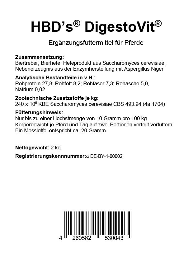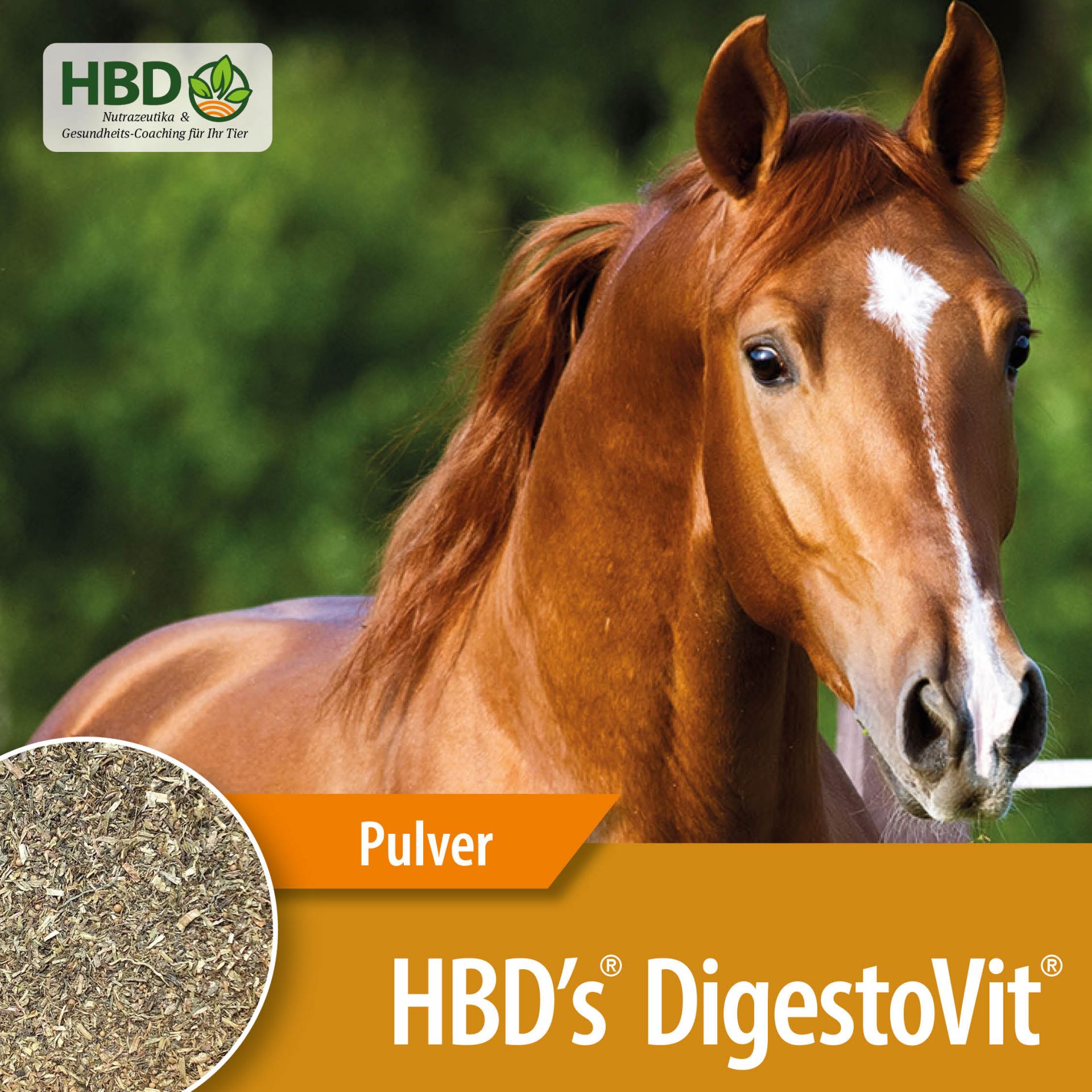 Bei Darmproblemen jeder Art ist es ist sehr wichtig, dass die Fütterung des Pferdes angepasst wird, so dass ein Einsatz von HBD’s® DigestoVit® erfolgreich verlaufen kann. Das Pferd sollte ausreichend sauberes, qualitativ einwandfreies Heu, sowie ein melassefreies, hochbioverfügbares Mineralfutter (z.B. HBD’s® HorseMineral MBA-frei) bekommen. Außerdem sollte das Krippenfutter keinesfalls Getreide, sowie zugesetzten Zucker, Kräuter(-dauergaben) oder sonstige belastende Stoffe (z.B. ätherische Öle) enthalten.