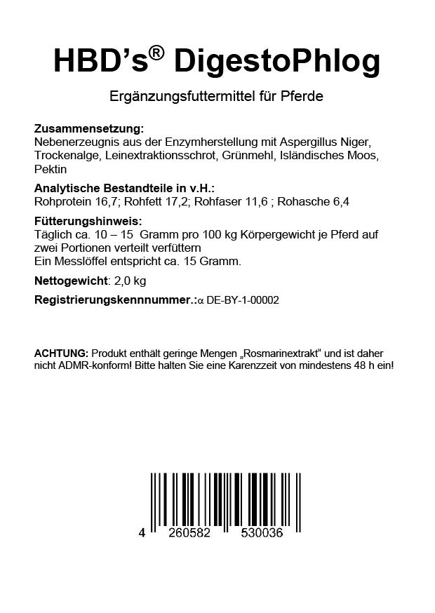 HBD’s® DigestoPhlog enthält ADMR-relevante Substanzen (Rosmarinextrakt). Bitte bei Turnierpferden eine Karenzzeit beachten. Spätestens 48 Stunden vor Turnierstart absetzen. Für Rennpferde gilt immer die Nulllösung vor dem Rennen.