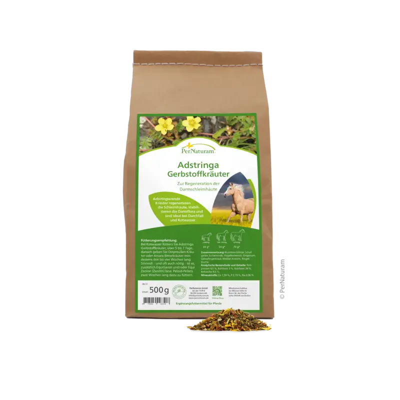 Die in den adstringierenden Kräutern enthaltenen Gerbstoffe dichten die Darmschleimhaut ab. Kombiniert wird Adstringa mit Amara-Bitterkräutern und, je nach Schwere des Problems, mit Terrasan und EquiGaron oder auch den Peloid-Pellets von PerNaturam.