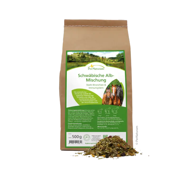 Die Wiesenpflanzen der Alb müssen im Sommer mit Hitze und Trockenheit, im Winter oft mit extremer Kälte fertig werden. Die Schwäbische Alb-Mischung enthält die typischen robusten Pflanzen der Kalkmagerrasen und der Wacholderheiden. Viele südliche Pferderassen sind von Ihrer Herkunft her ähnliche Böden und Kräutermischungen gewöhnt. Für sie ist die Schwäbische Alb-Mischung die artgerechte Ergänzung. Die Kombination der Kräuter gleicht ernährungsbedingte Störungen des Stoffwechsels aus und hilft, das körpereigene Immunsystem, besonders im Bronchialbereich, zu aktivieren. Die aromareiche Mischung wirkt besonders positiv auf die Schleimhäute, insbesondere die der Atemwege, und sie aktiviert das Immunsystem. Die Schwäbische Alb-Mischung sollte bei unbestimmtem, trockenem Husten und stauballergischen Reaktionen sowie zur Rekonvaleszenz eingesetzt werden.
