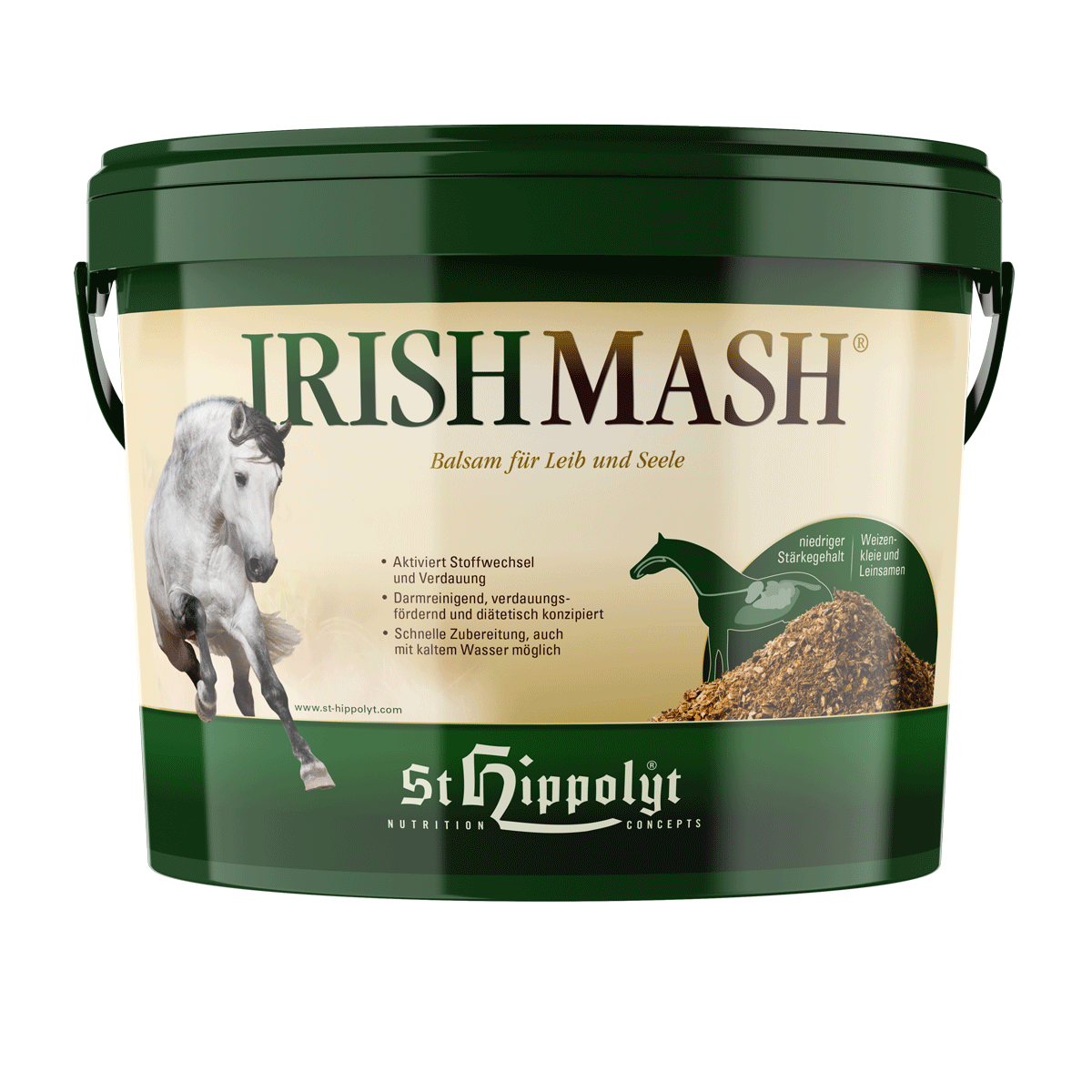 Irish Mash® ist ganz besonders schmackhaft, eng angelehnt an die ursprüngliche traditionelle Rezeptur aus Weizenkleie und Leinsamen und nach den neuesten ernährungswissenschaftlichen Erkenntnissen weiterentwickelt. Die im Spezialverfahren schonend gecrackte gelbe Leinsaat erlaubt eine rasche Zubereitung ohne Kochen. Die Verdaulichkeit und die diätetische Wirkung werden durch einen niedrigen Gehalt an Stärke, hoch aufgeschlossenes Getreide, Koriander und Bierhefe gewährleistet. Aufgrund seiner darmpflegenden Eigenschaften kann es bei schwerfuttrigen Pferden die Futterverwertung und damit den Gewichtsaufbau verbessern. Irish Mash® unterstützt die Regeneration nach Wettkämpfen, Deckeinsatz und Fohlengeburten und hat sich im Fellwechsel besonders bewährt.