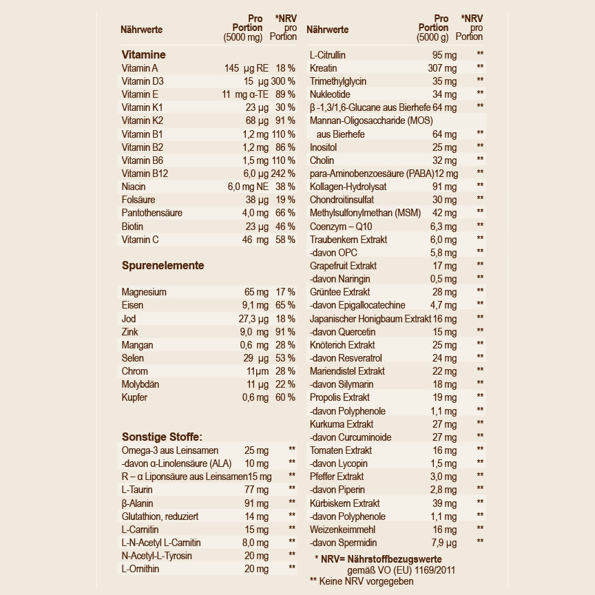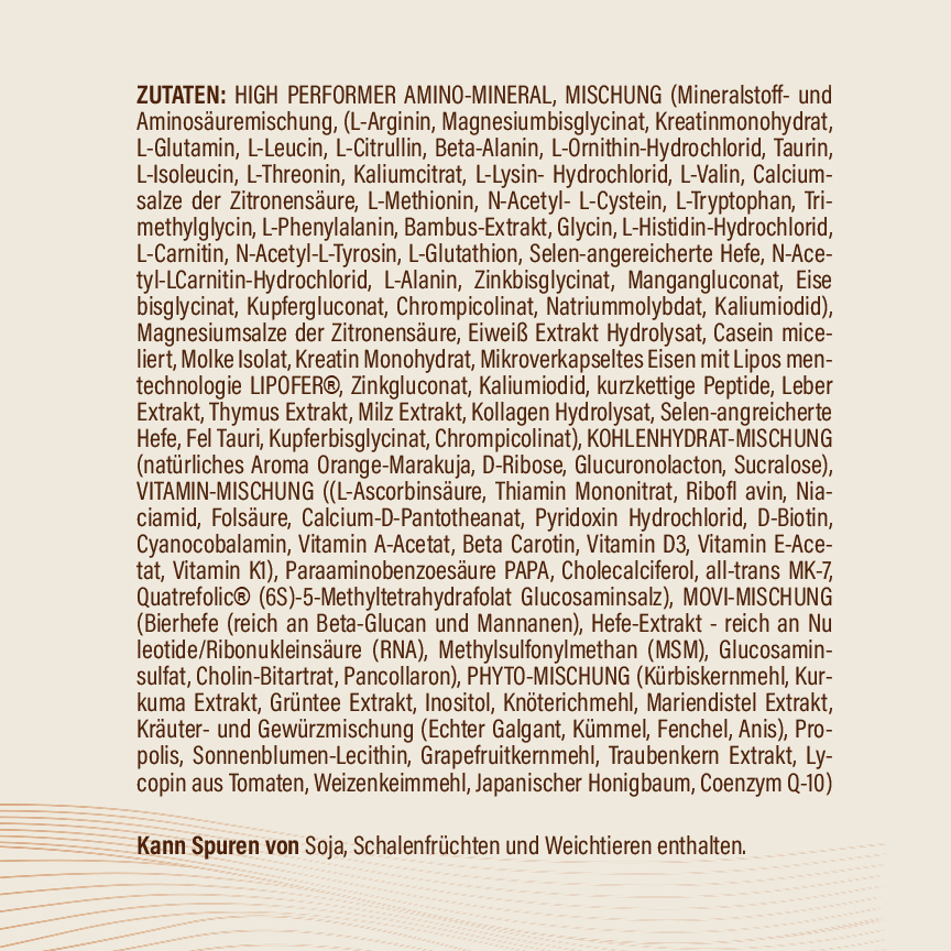 High Performer AMINO-MINERAL-MISCHUNG 61 % (Mineralstoff- und Aminosäuremischung (L-Arginin, Magnesiumbisglycinat, Kreatinmonohydrat, L-Glutamin, L-Leucin, L-Citrullin, Beta-Alanin, L-Ornithin-Hydrochlorid, Taurin, L-Isoleucin, L-Threonin, Kaliumcitrat, L-Lysin-Hydrochlorid, L-Valin, Calciumsalze der Zitronensäure, L-Methionin, N-Acetyl-L-Cystein, L-Tryptophan, Trimethylglycin, L-Phenylalanin, Bambus-Extrakt, Glycin, L-Histidin-Hydrochlorid, L-Carnitin, N-Acetyl-L-Tyrosin, L-Glutathion, Selen-angereicherte Hefe, N-Acetyl-L-Carnitin-Hydrochlorid, L-Alanin, Zinkbisglycinat, Mangangluconat, Eisenbisglycinat, Kupfergluconat, Chrompicolinat, Natriummolybdat, Kaliumiodid), KOHLENHYDRAT-MISCHUNG 19,3 % (D-Ribose, Glucuronolacton, natürliches Orangen-Aroma mit weiteren natürlichen Aromen), PHYTO-MISCHUNG 9 % (Kürbiskern Mehl, Omega-3-Fettsäuren, Kurkuma, Kräuter- und Gewürzmischung (Echter Galgant, Kümmel, Fenchel), Grüntee Extrakt, Knöterich, Inositol, Mariendistel, Propolis Extrakt, Grapefruitkernmehl, Lycopin, Weizenkeimmehl, Japanischer Honigbaum, Alpha-Liponsäure, Sonnenblumenlecithin, Coenzym Q10, Traubenkern Extrakt, schwarzer Pfeffer Extrakt), MOVI-MISCHUNG 9 % (Chondroitinsulfat, gewonnen durch mikrobielle Fermentation und Sulfatierung, Hyaluronsäure, Nukleotide, Hefezell Extrakt, Methylsulfonylmethan (MSM), Glucosaminsulfat, Kollagen-Hydrolysat, p-Aminobenzoesäure), VITAMIN-MISCHUNG 1,7 % (L-Ascorbinsäure, DL-Alpha-Tocopherylacetat, Retinylacetat, Beta-Carotin, Nicotinamid, Cyanocobalamin, Calcium-D-Pantothenat, Pyridoxinhydrochlorid, Cholecalciferol, Thiaminmononitrat, Riboflavin, Phyllochinon, Menachinon (MK7 alltrans), Pteroylmonoglutaminsäure, D-Biotin).