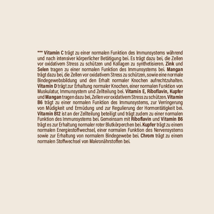 Vitamin C trägt zu einer normalen Funktion des Immunsystems während und nach intensiver körperlicher Betätigung bei. Es trägt dazu bei, die Zellen vor oxidativem Stress zu schützen und Kollagen zu synthetisieren.