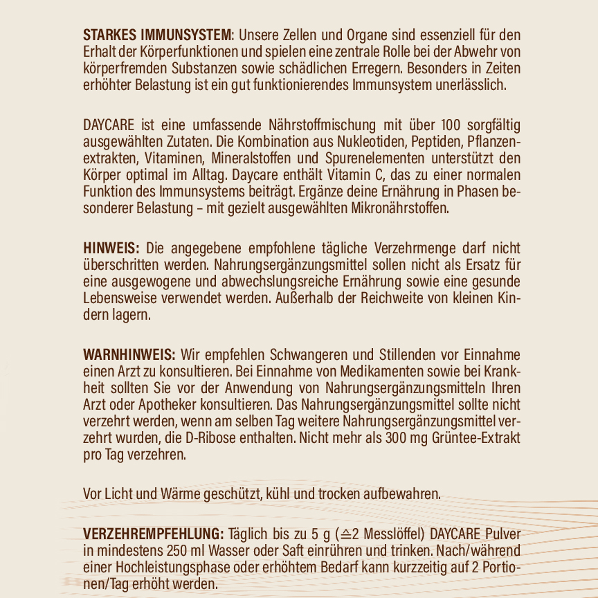 DAYCARE ist eine spezielle Nährstoffmischung, die über 100 sorgfältig ausgewählte Zutaten enthält. Sie vereint Nukleotide, Peptide, Pflanzenextrakte, Vitamine, Mineralstoffe und Spurenelemente, um den Körper im Alltag bestmöglich zu unterstützen. Besonders hervorzuheben ist Vitamin C, das zu einer normalen Funktion des Immunsystems beiträgt.***