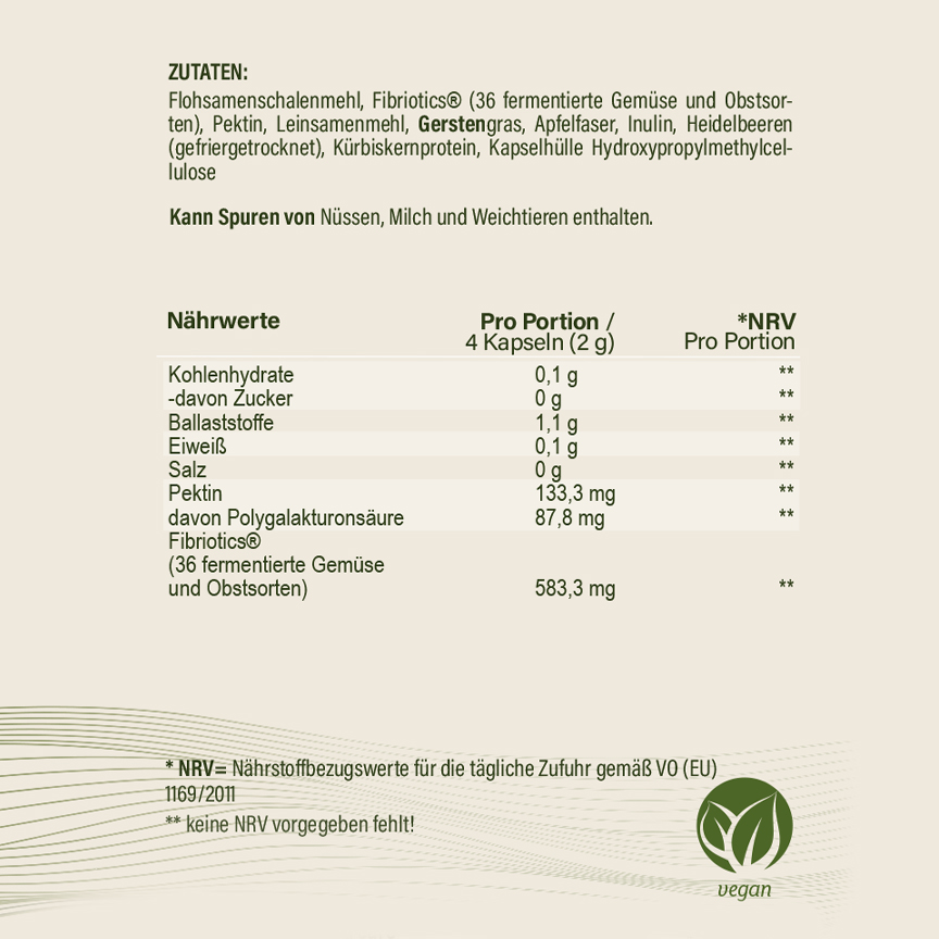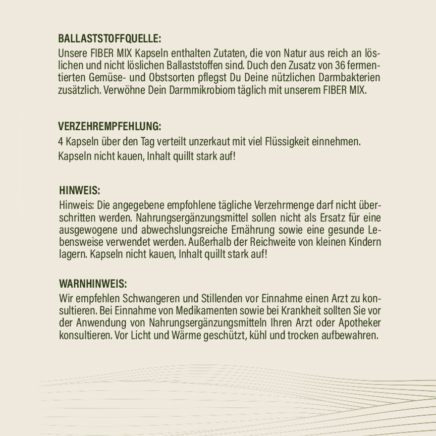 Die FIBER MIX Kapseln enthalten natürliche Zutaten, die reich an löslichen und nicht löslichen Ballaststoffen sind, wie Flohsamenschalen, Leinsamen, Inulin und Pektin. Diese Ballaststoffe dienen als Nahrung für das Darmmikrobiom und können auf natürliche Weise bei Verdauungsproblemen helfen. Zusätzlich sind 36 fermentierte Gemüse- und Obstsorten enthalten, die deinem Darm eine Extraportion Pflege bieten. Durch die Fermentation werden die Pflanzenstoffe besonders gut vom Körper aufgenommen und fördern das Wachstum nützlicher Darmbakterien.