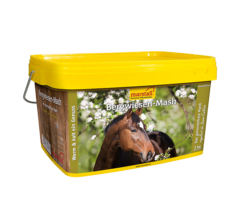 Marstall Bergwiesen-Mash ist ein leicht verdauliches Ergänzungsfutter für Pferde ohne Getreide und Melasse sowie ohne Zusatz von Zucker, Vitaminen oder Mineralien. Durch den reichhaltigen Zusatz der marstall Previta-Faser wirkt es prebiotisch und fördert die Darmtätigkeit.