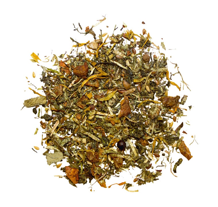 Aufwuchs von Allgäuer Dauergrünland, getrocknet (35%), Leinextraktionsschrot (22,5%), Obsttrester (Apfel) (21%), Leinsamen (10%), Zichorienpülpe getrocknet, Kräuter (Brennnessel, Eukalyptus, Koriander, Fenchelsaat, Eibischblätterkraut, Thymian, Kamille, Bockshornklee, Birkenblätter, Anis, Fichtennadeln, Spitzwegerichkraut, Kümmel, Salbei, Wacholderbeeren, Knoblauchgranulat) (2%), Pflanzenöl aus Raps, raff. (2%), Calciumcarbonat, Biertreber, Bierhefe (0,8%), Ringelblumenblüten, Bockshornklee, Natriumchlorid (Stand: 02.2016)