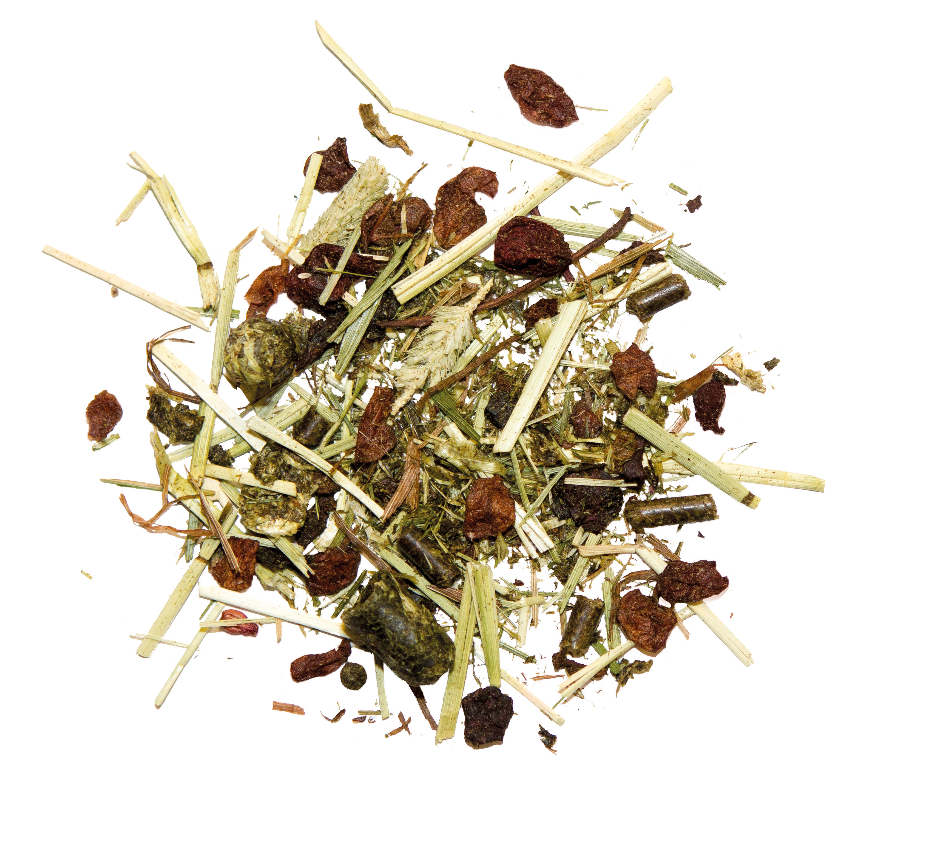 Gras, hochtemperaturgetrocknet (48,00 %), Traubentrockentrester (15,00 %), Sojaextraktionsschrot (14,00%), Leinextraktionsschrot (10,50 %), Pflanzenöl (Raps, raff.) (4,00 %), Gras, hochtemperaturgetrocknet (Timothee) (3,00 %), Calciumcarbonat (1,00 %), Bierhefezellwände (Saccharomyces cerevisiae) (1,00 %), Magnesiumoxid (0,90 %), Natriumbicarbonat (0,80 %), Monocalciumphosphat (0,50 %)