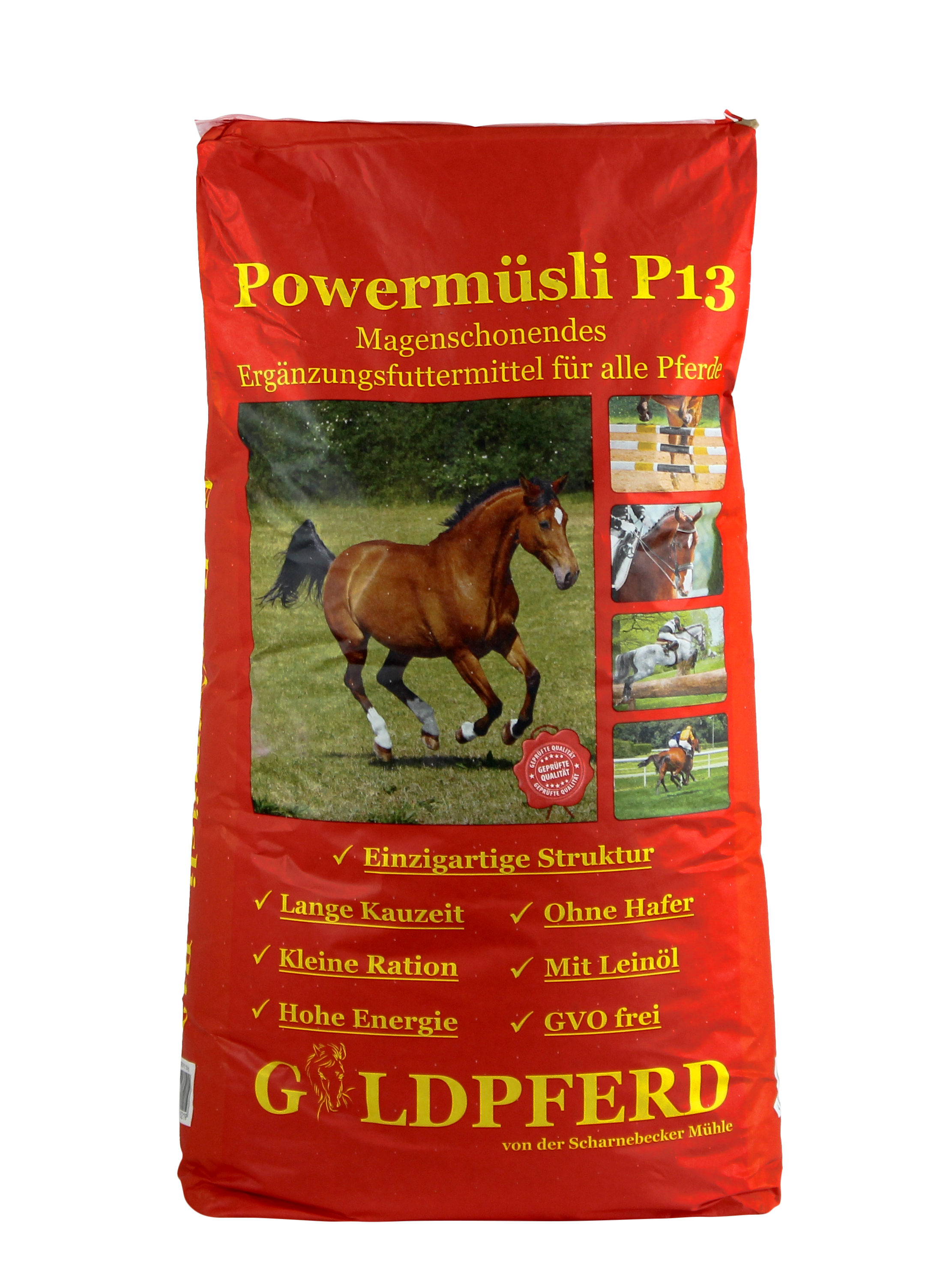 Goldpferd Power Müsli P13 ist ein Kraftfutter, welches sich auf aktuelle wissenschaftliche Erkenntnisse stützt und eine optimale Energiezufuhr bei einer minimalen Futtermenge gewährleistet.